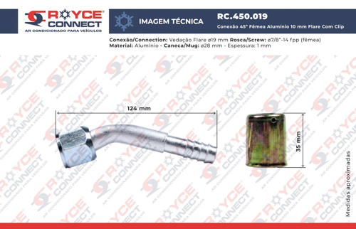 Conexão Flare 45º Fêmea 10mm Aluminio c/ clip