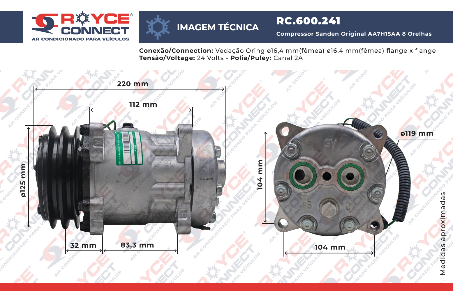 Compressor SANDEN Original AA7H15AA 4862 Modelo Flex 8 Orelhas Saida Traseira O´ring Horizontal Flex 200cc - 24 Volts Polia 2A 125mm